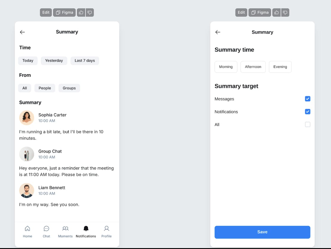 휴대폰의 모든 메시지, 알람을 모아서 내가 원할때 한번에 요약해주는 앱을 만들 거야. 요약 화면, 그리고 요약 시간과 요약할 대상을 선택할 수 있는 설정 화면을 만들어 줘.한국인 정서에 맞는 캐주얼하고 트랜디한 스타일로 바꿔줘보낸 사람 목록은 제거하고, 폰트를 Noto sans로 적용해줘.아직 Beta 버전이라 그런지, 실제 세부 조정은 아쉬운 부분들이 보였습니다. 폰트 수정 등은 피그마 AI를 활용하는 것이 낫겠다는 생각이 듭니다. 그리고 Galileo AI 특유의 디자인 스타일이 남아있는것 같습니다.
