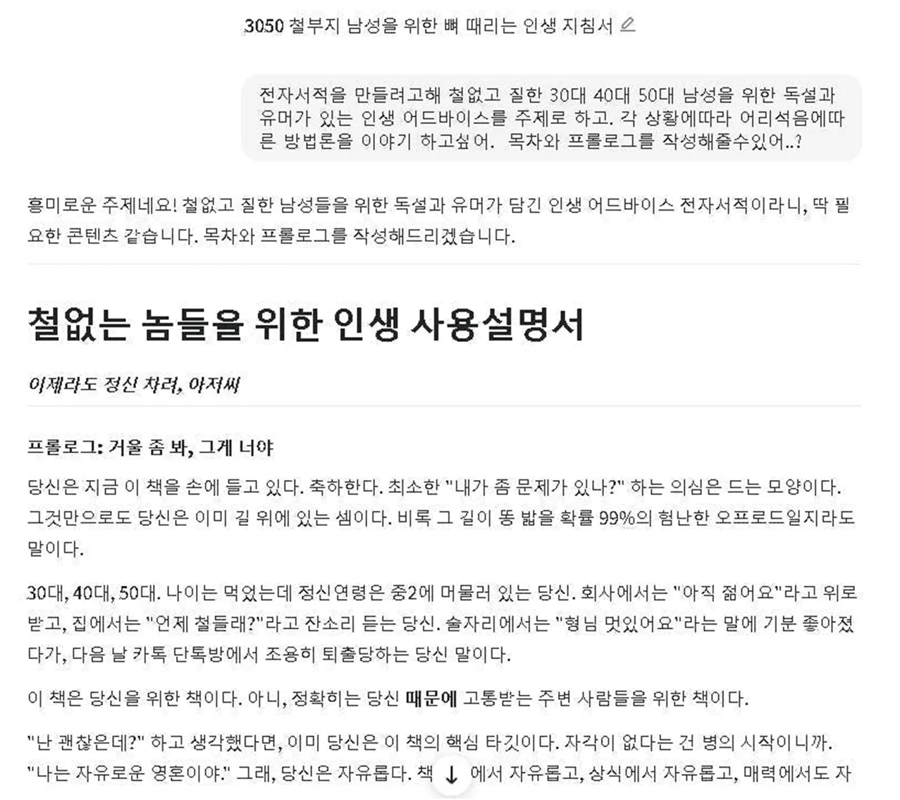 우선 목차와 플로로그를 작성하였으나. 좀더 많은 사례를 통해. 독자가 공감가는 이야기로 작성을 하려고 합니다. 그런 사례의 데이터를 모아 더욱 유머와 독설이 가득한 책을 꾸미려합니다만 자료를 얻는데 시간이 걸리는군요. 그리고. 결과물을위해 워드가 나은지E-PUB(처음듣는..) 이 나은지도 한법 구현해 보려고 합니 다. 그래도 제일 고민은 역시 내용의 질과 양이 아닐까 살짝고민이됩니다.