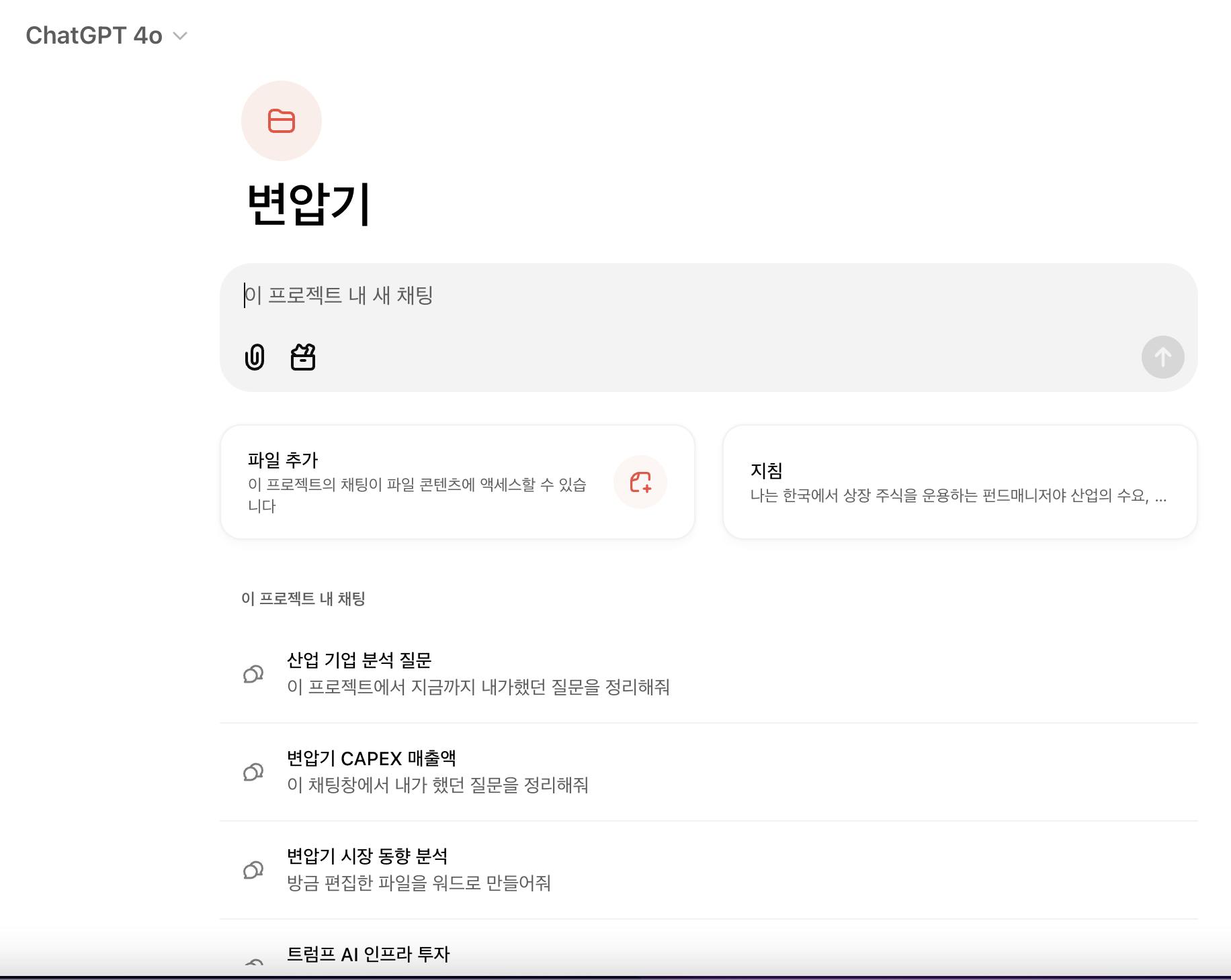 2-1) "변압기"라는 프로젝트 파일을 만들고 이 안에 변압기 제품에 대한 수요,공급,가격동향,최근 AI 서버 등장에 따른 변화 요인,트럼프의 최신 투자까지 질문