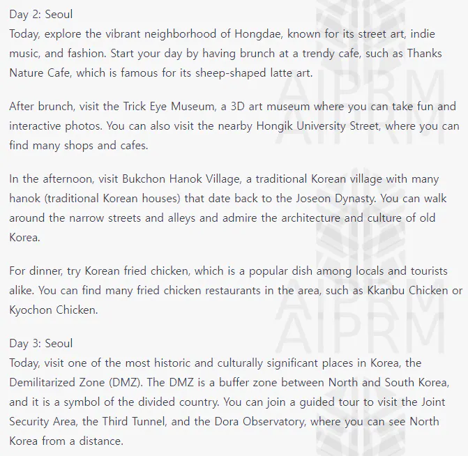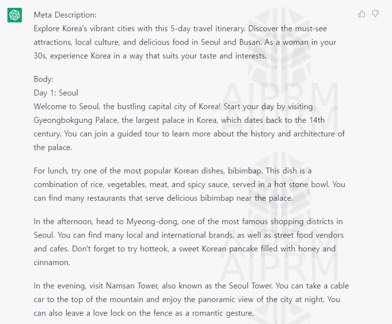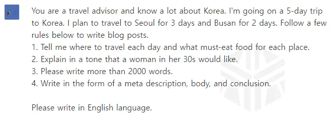 서울 가볼만한 곳으로 글쓰기를 시켜봤는데, 몇 가지 조건을 주었습니다. (조건은 굉장히 단순..) * 모두 프롬프트 지니를 활용해 한글로 입력하였습니다.
