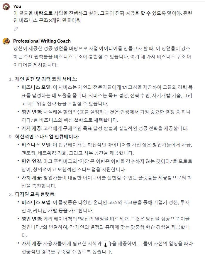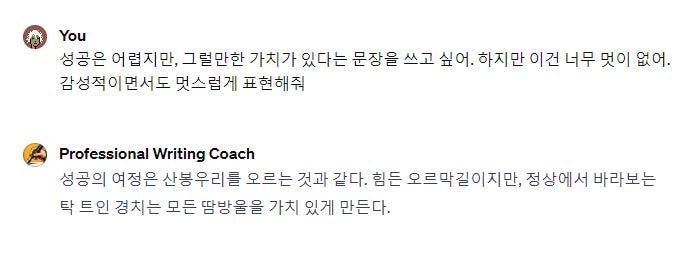 사용환경은 #GPT4 이며, 사용 챗봇은 #GPT 사 에서 만든 프로페셔널 라이팅 코치 이다.