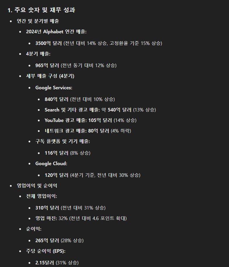 알파벳의의 컨퍼런스 콜 요약 예시 (컨퍼런스 콜 스크립트 삽입 → 요약 요청 / ChatGPT o3-mini)