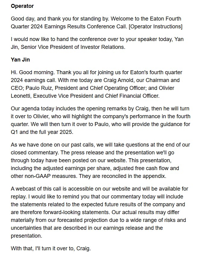 Eaton의 컨퍼런스 콜 요약 예시 (컨퍼런스 콜 스크립트 삽입 → 요약 요청)