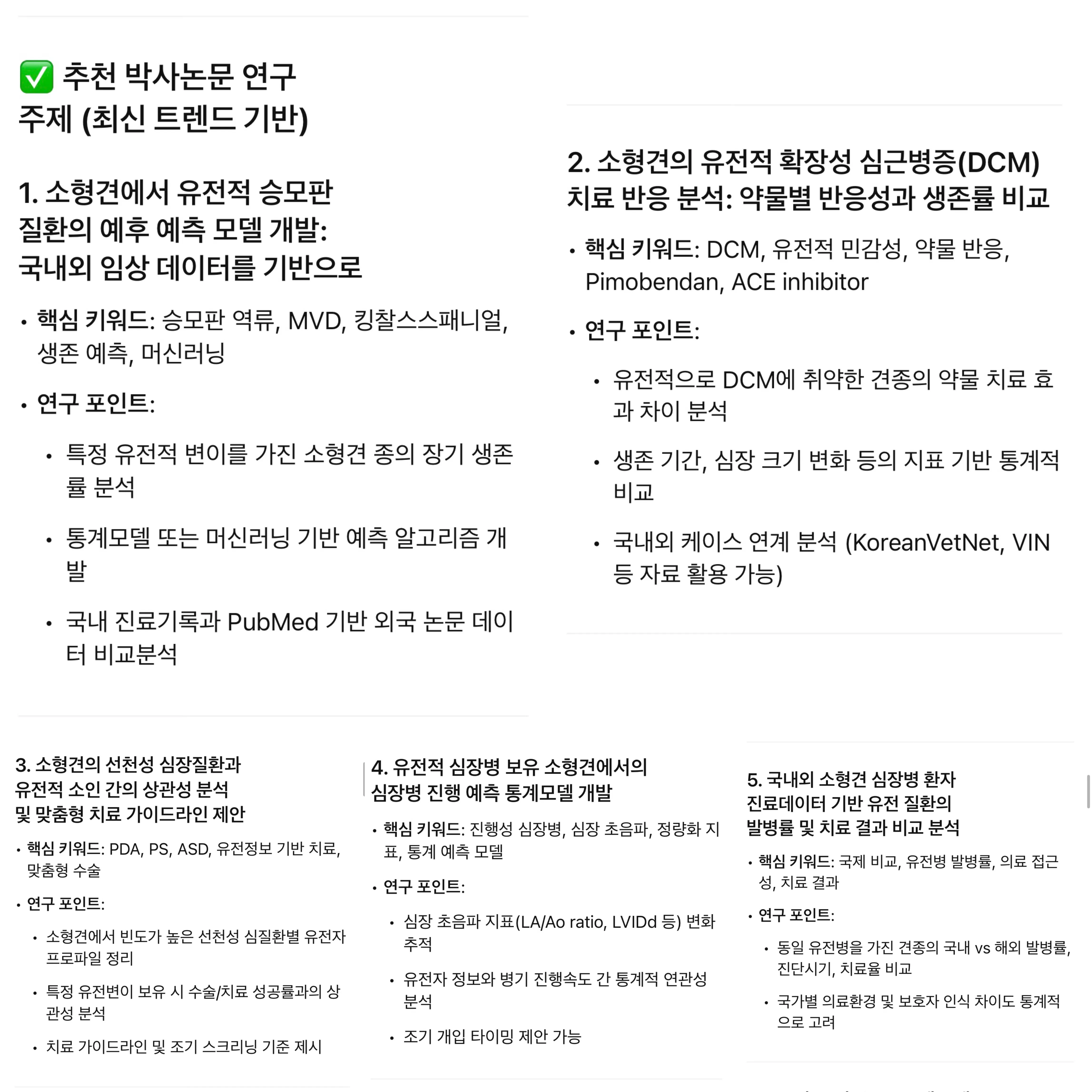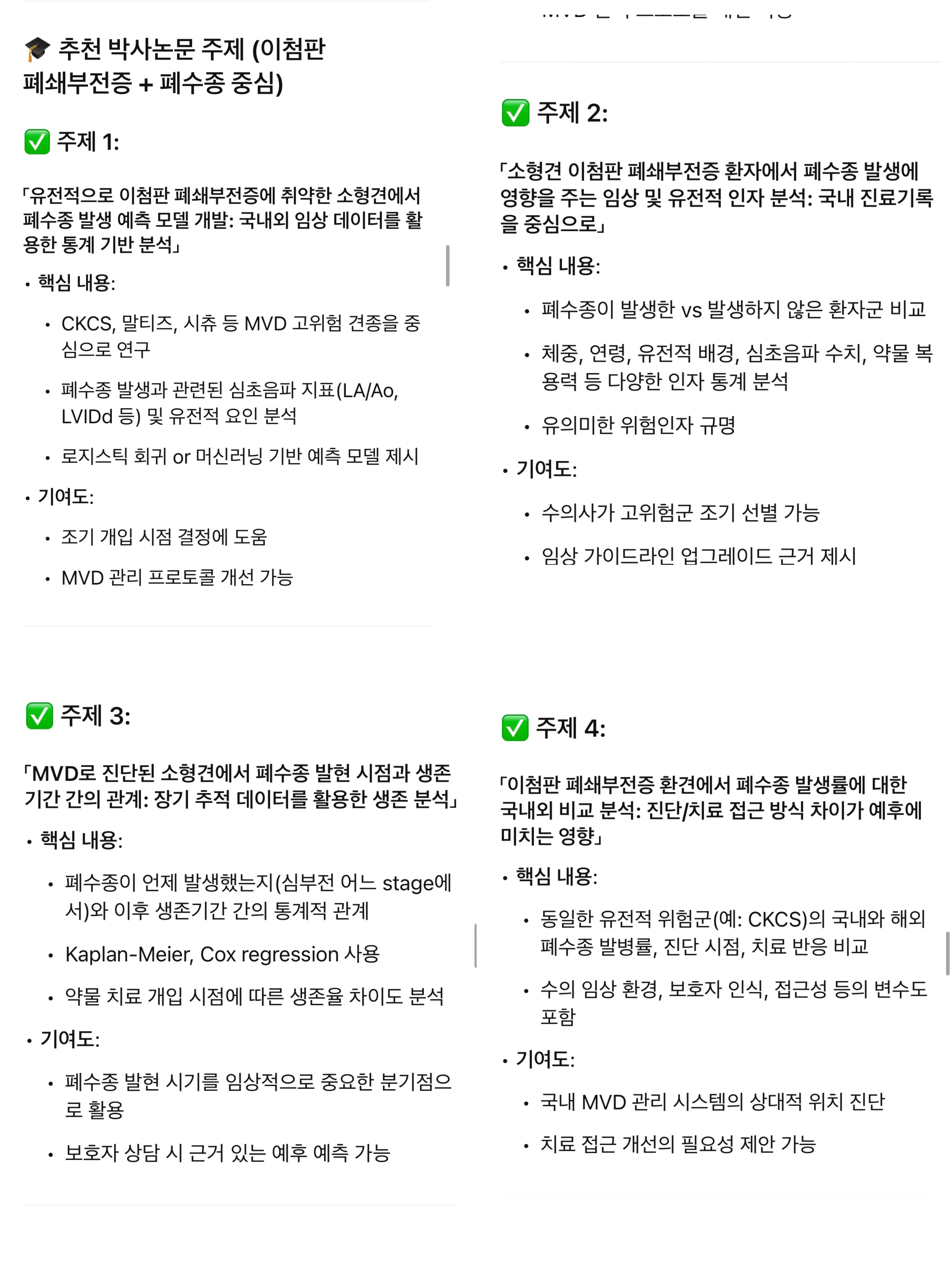 저는 폐수종, 심장비대증 등 합병증을 동반한 환견의 생존율 및 치료 반응 차이를 연구 주제로 삼고자 했습니다.