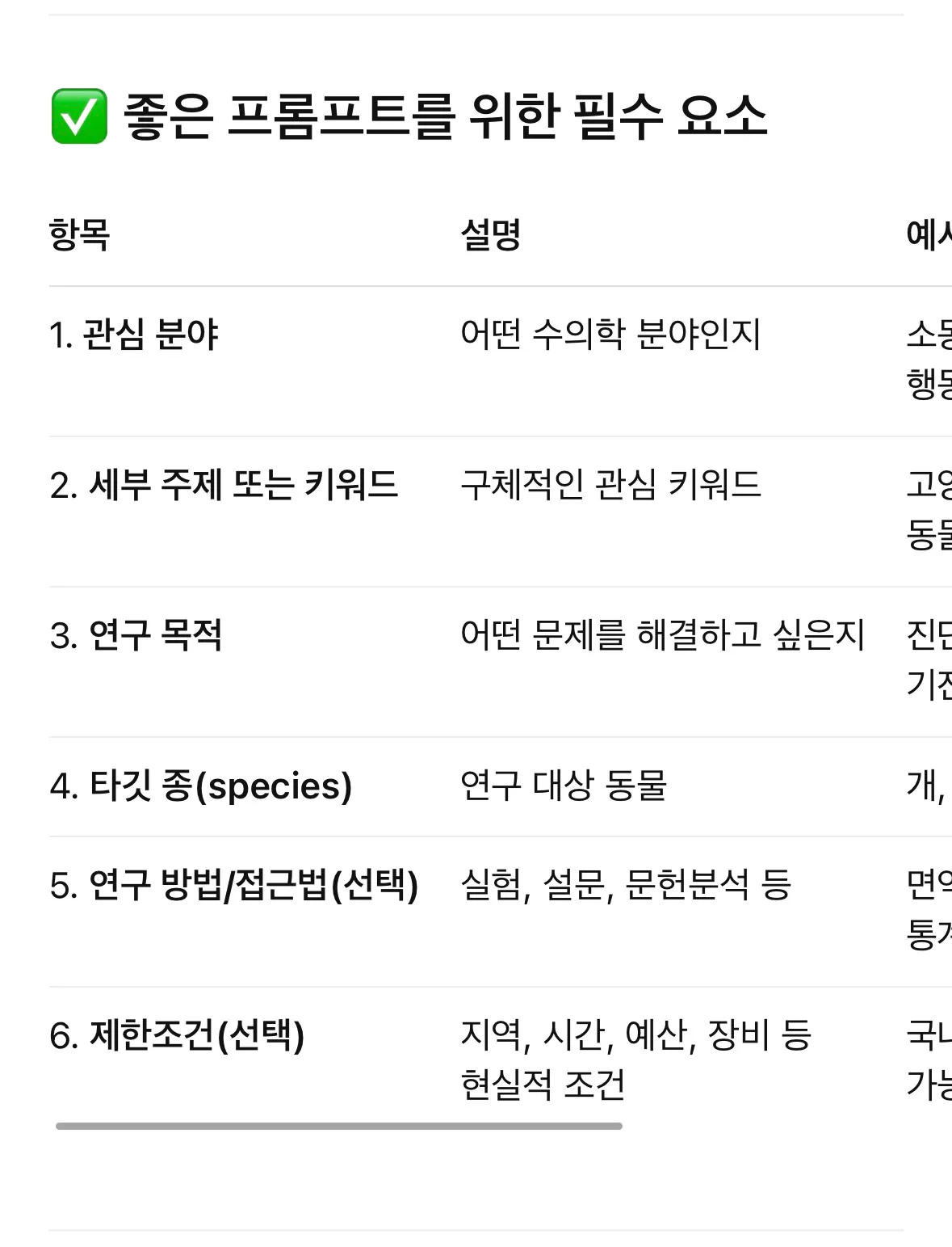 프롬프트 예시와 필수요소를 정리해주었습니다.