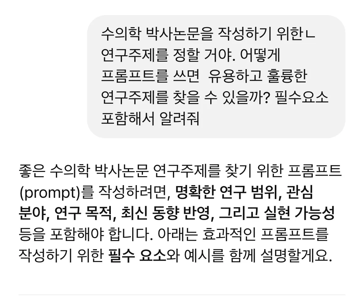 논문 작성 스터디에서 프롬프트를 작성하여 논문 주제찾기를 진행했습니다.