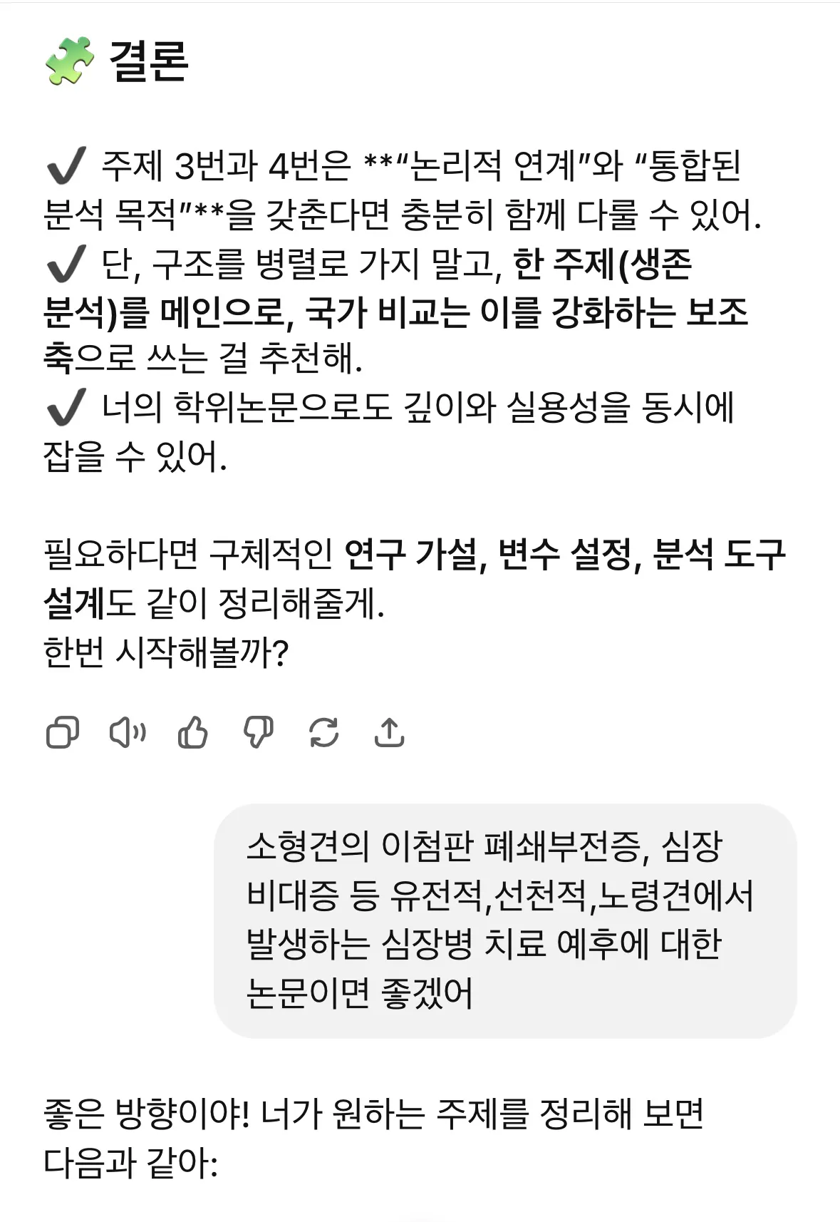• 유용했던 점: 막연했던 아이디어를 구체화하는 데 GPT의 질문 유도 방식이 큰 도움이 되었습니다. 주제 후보들을 비교하며 자연스럽게 타당성을 검토할 수 있었습니다.