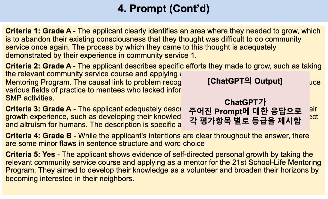 우리 팀이 발표한 것은 Large Language Model인 ChatGPT가 자기소개서 평가 도구로 활용될 수 있는지에 대한 질문에서부터 시작된 연구.
