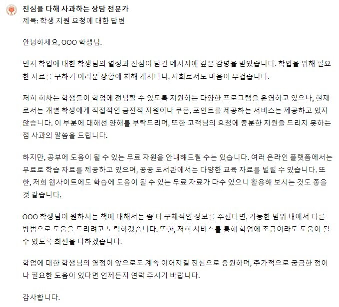 사과문 GPTs는 특정 정보를 안내하는 용도가 아닌, 불만 고객에게 사과를 드리기 위한 목적입니다. 그렇기 때문에 안내를 할 때에는 오류가 발생할 수 있습니다.