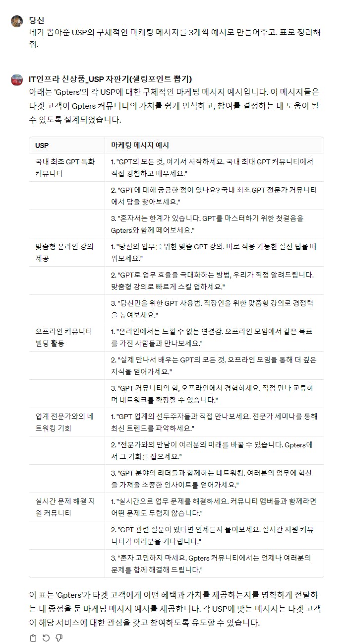 IT인프라 쪽에 특화된 로봇으로 설정했는데, 정작 예시는 좀 엉뚱한 Gpters USP를 뽑아달라고 요청했습니다.