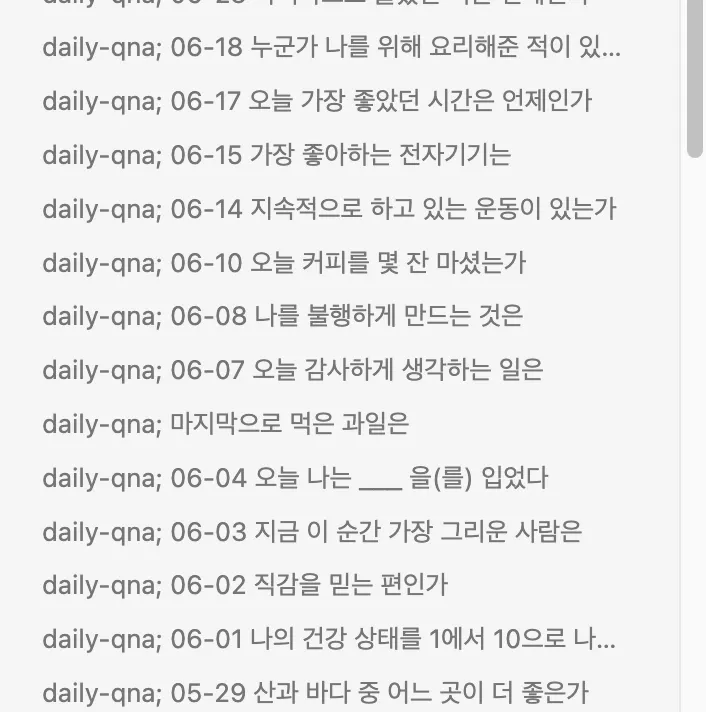 매일 자신에 대해 질문하고 답변을 기록하는 습관이 있어, 자기 성찰과 개인적 성장에 관심이 많은 것으로 보입니다.