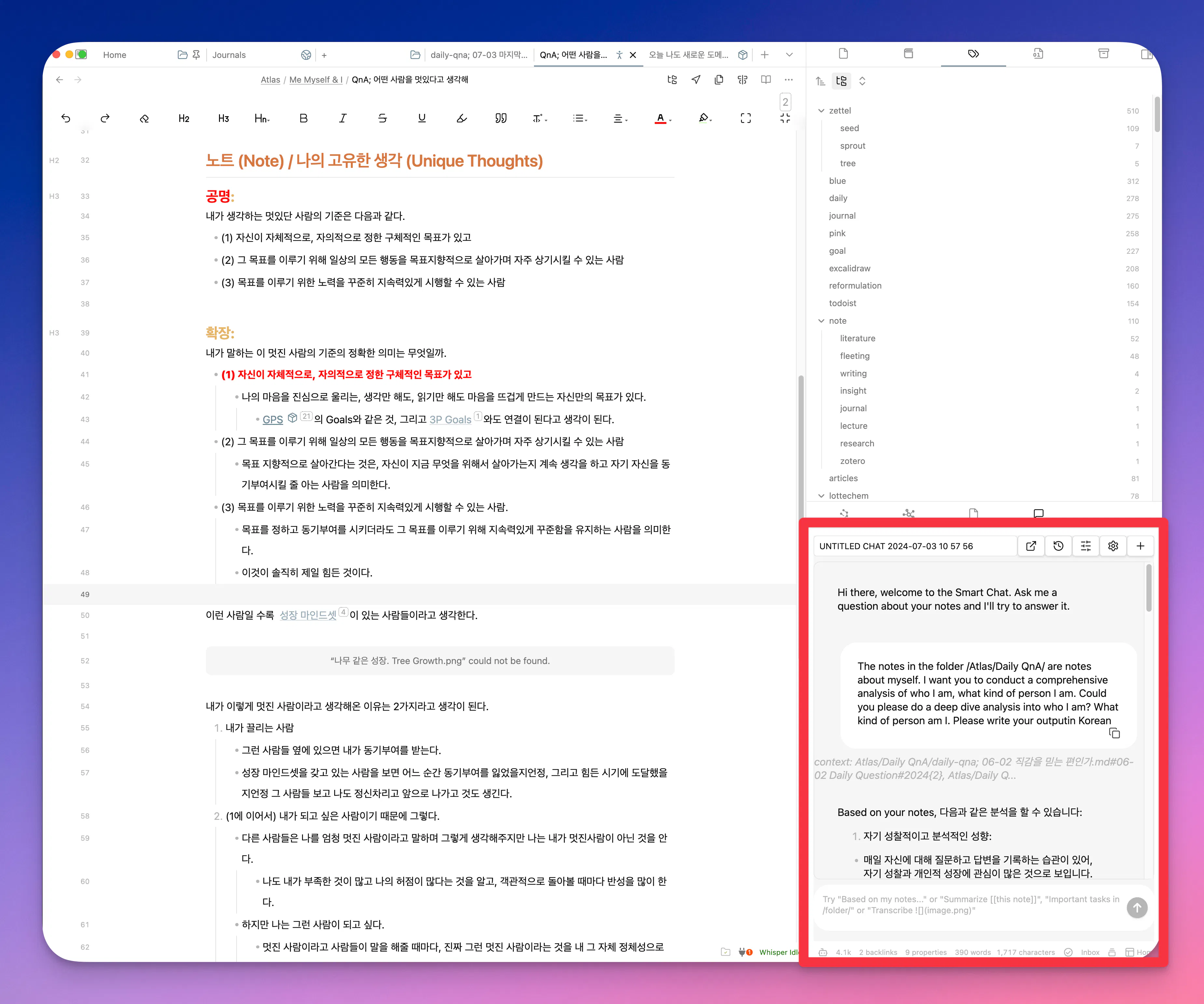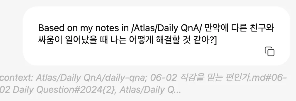 Smart Connections를 사용하면 이렇게기록을 하는 와중에 나의 노트과 대화를 할 수 있습니다. 이런 기능을 이용해서 나와 대화를 해봤습니다.