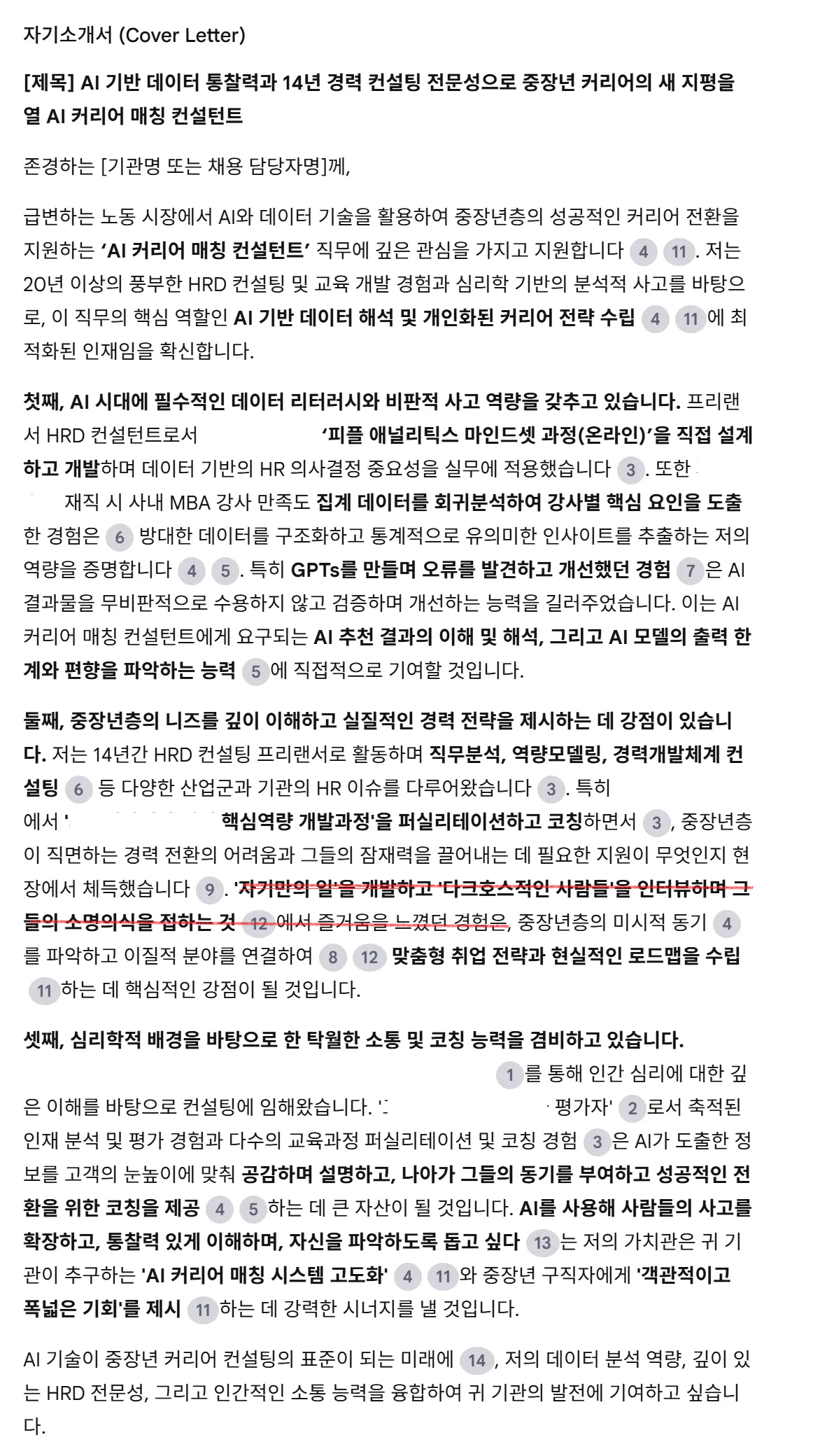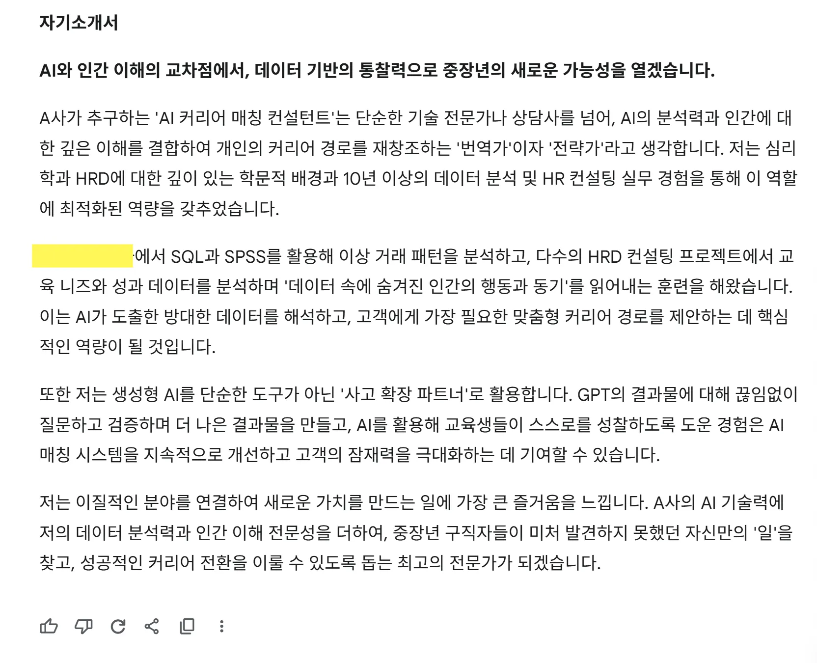 - AI커리어 매칭 컨설턴트 직무의 핵심 역할 및 책임, 필요 역량과 연관성을 어필할 수 있도록 작성하세요