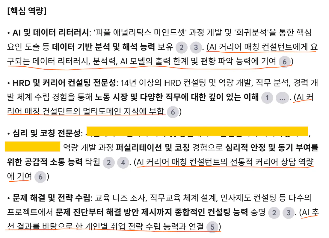 노트북LM(아래 이미지)은 대상 직무에서 요구하는 역량과 매핑해서 이력을 기술. 챗GPT4.5와 Gemini2.5pro는 기술 방식이 평이하고 일부 빼먹음.