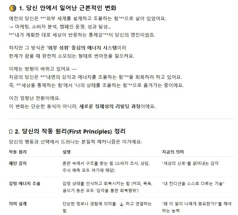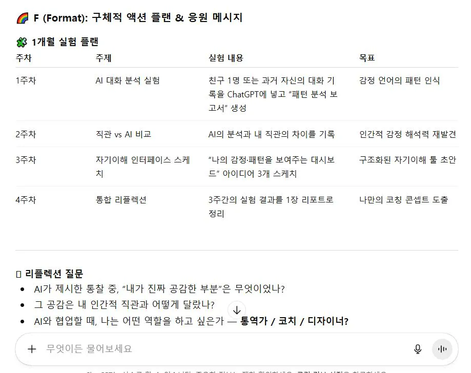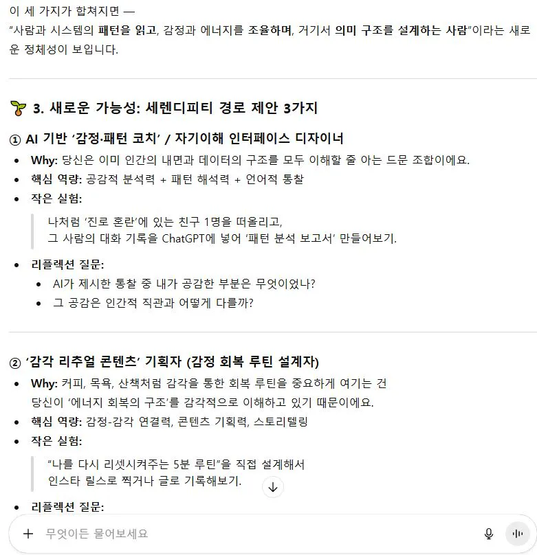 현재 나의 상황 파악을 토대로 커리어 전환에 도움이 되는 기초 작업을 진행함. 기존에 만들고 싶은 커스텀 챗봇 AI (감정 힐링쪽)이 있어서 이에 활용하고자 구체적이고 다양한 질문을 통해 프롬프트 만드는데 도움을 얻고자 함.