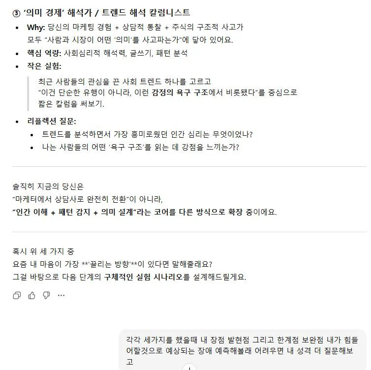 1) 과거 일한 경험 + 현재 상황을 솔직하게 작성하여 3가지 직업을 추천받음
