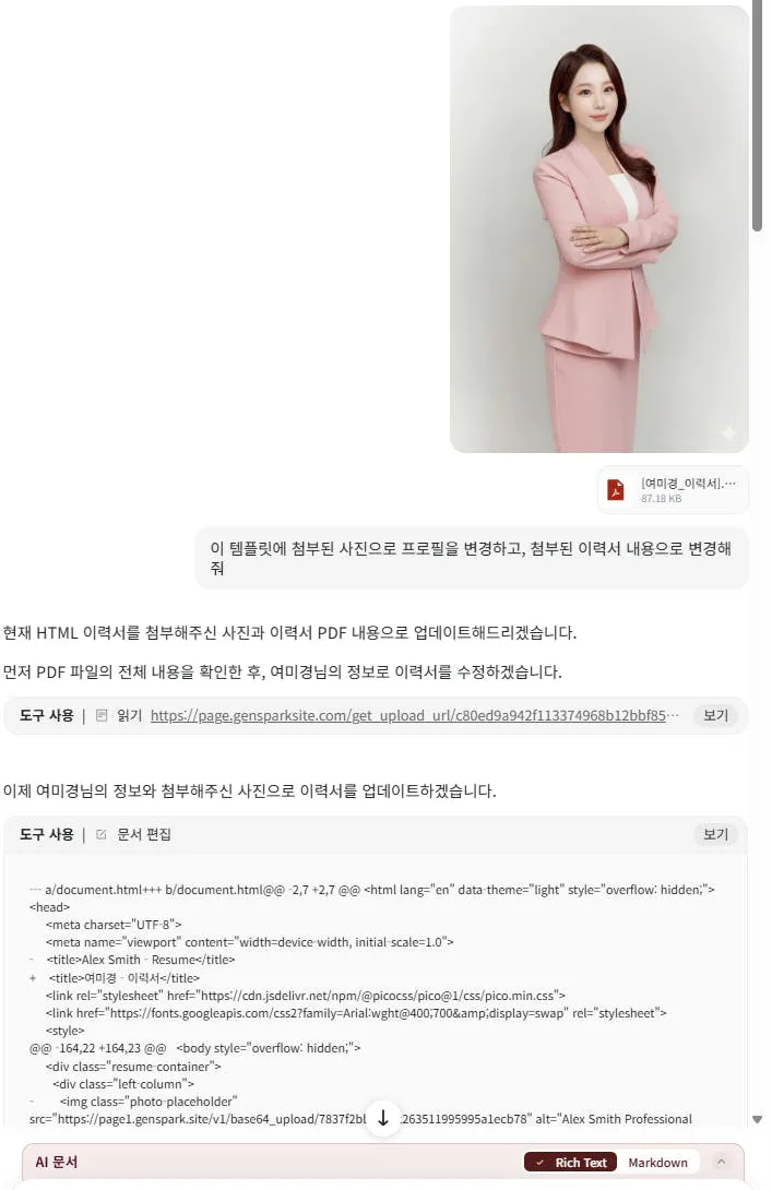 • 젠스파크에서 AI 이력서 템플릿 만드는법 알려주셔서 해봤는데, 디자인이 마음에 들어 강의에 활용할 슬라이드도 제작했어요.