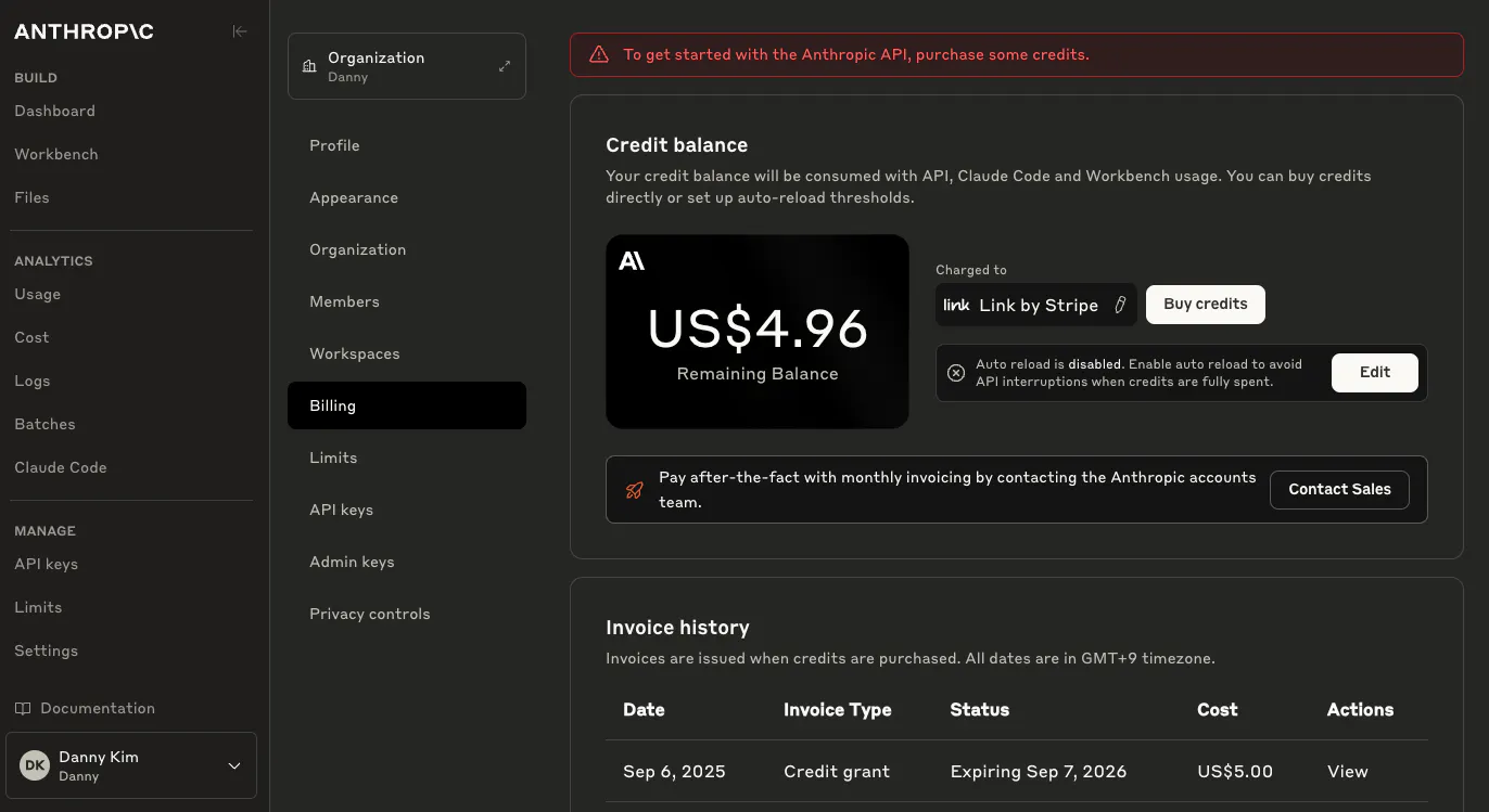 • 2) Anthropic 웹사이트에서 결제 정보 설정: