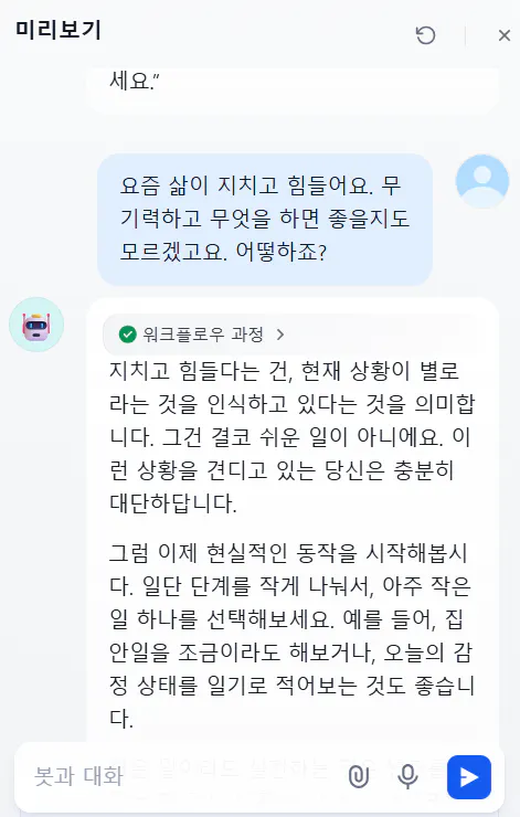 미리보기 하면서 챗봇과 대화하면서 test 해봅니다.