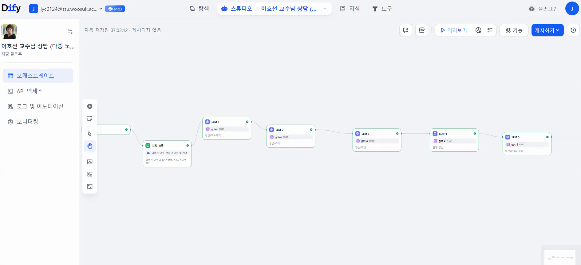 LLM을 단계별로 여러 개 노드를 만들어 보라고 해서 그대로 따라해 봅니다.