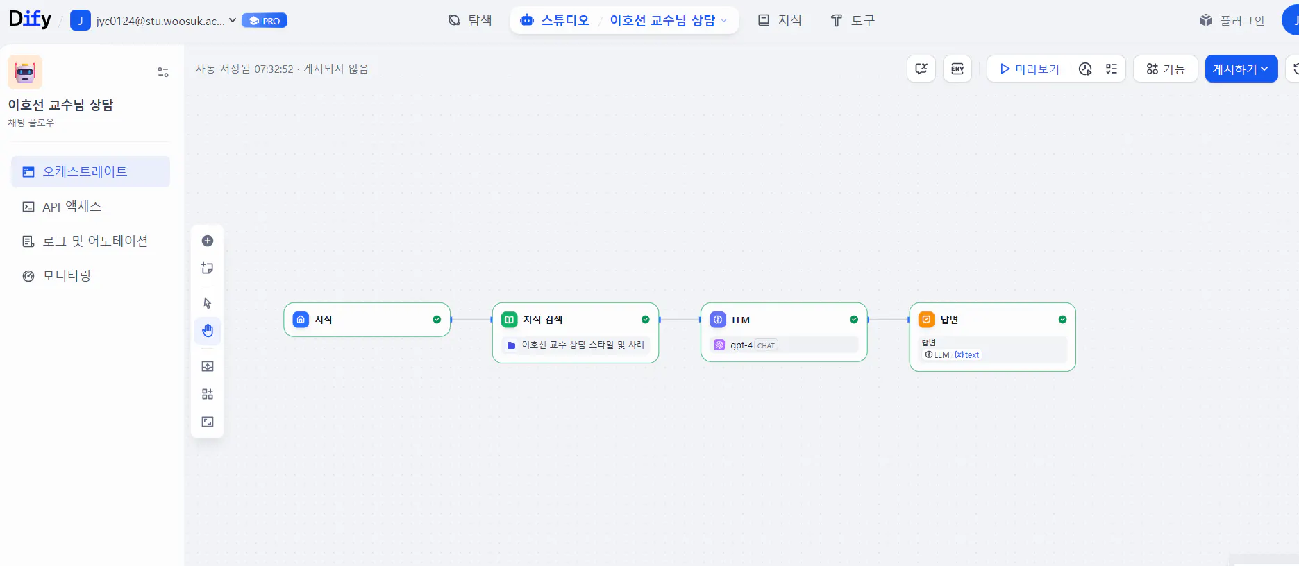 만들어낸 파일들을 Dify의 지식에 '이호선 교수님 상담 스타일 및 사례'라는 제목으로 심어주었습니다.
