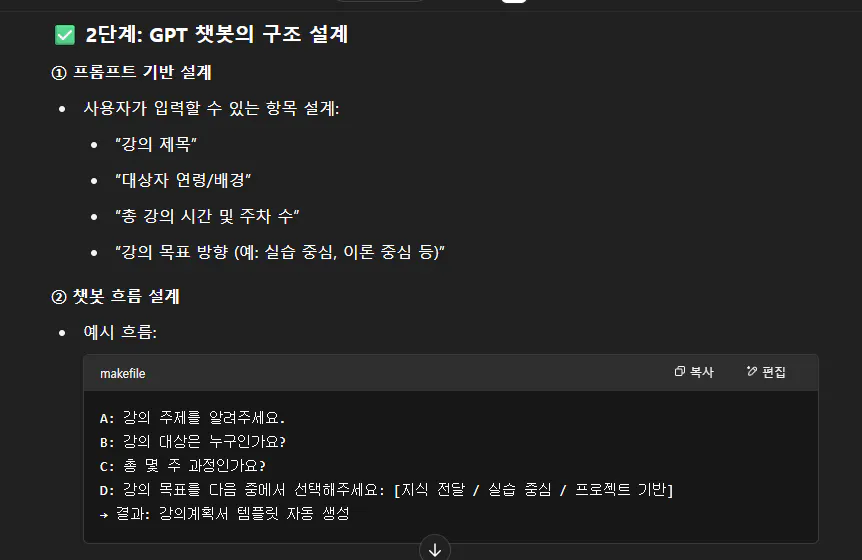 ChatGPT에게 강의 방식 또는 형식을 반영해서 단계별로 만들어야겠다고 느꼈습니다.
