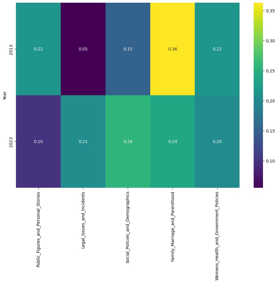 2013년, 2023년에 ‘출산’에 관련된 잠재된 주제들이 어떻게 분포하는지 고차원적으로 시각화한다면 어떤 모습인지?