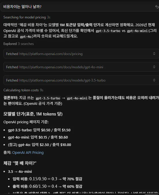 토큰 사용량 변화: 모델이 더 “잘 설명”해서 출력이 길어지면 비용 절감폭이 줄 수 있음 → 필요 시 추후 temperature/출력 길이 규칙으로 보정