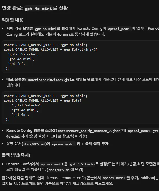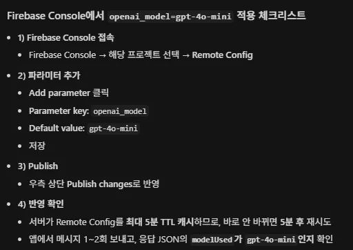 gpt-4o-mini는 이미 허용 목록에 포함되어 있어, Remote Config 값만 설정하면 즉시 전환 가능합니다.