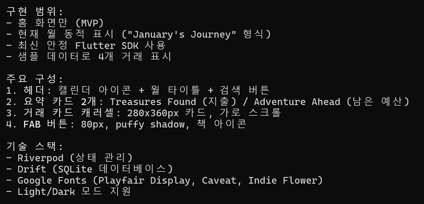 Flutter 프로젝트를 만들어 줘. Flutter 3.24 버전을 사용해 줘.구현 플랜이 이렇게 세워졌습니다. 중간에 명료하지 않은 부분은 제가 선택했습니다.
