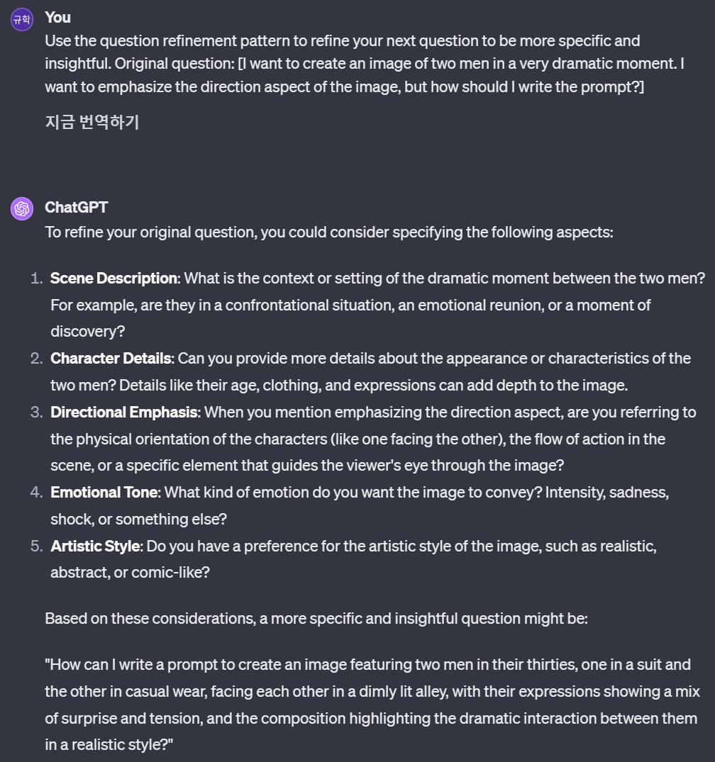 Question Refinement Pattern을 통해 다음 질문을 다듬어 달라고 요청하였습니다. “극적인 두 남자의 이미지를 그리고 싶으며, 이미지의 연출 측면에서 강조를 하는 방법이 무엇인가?”