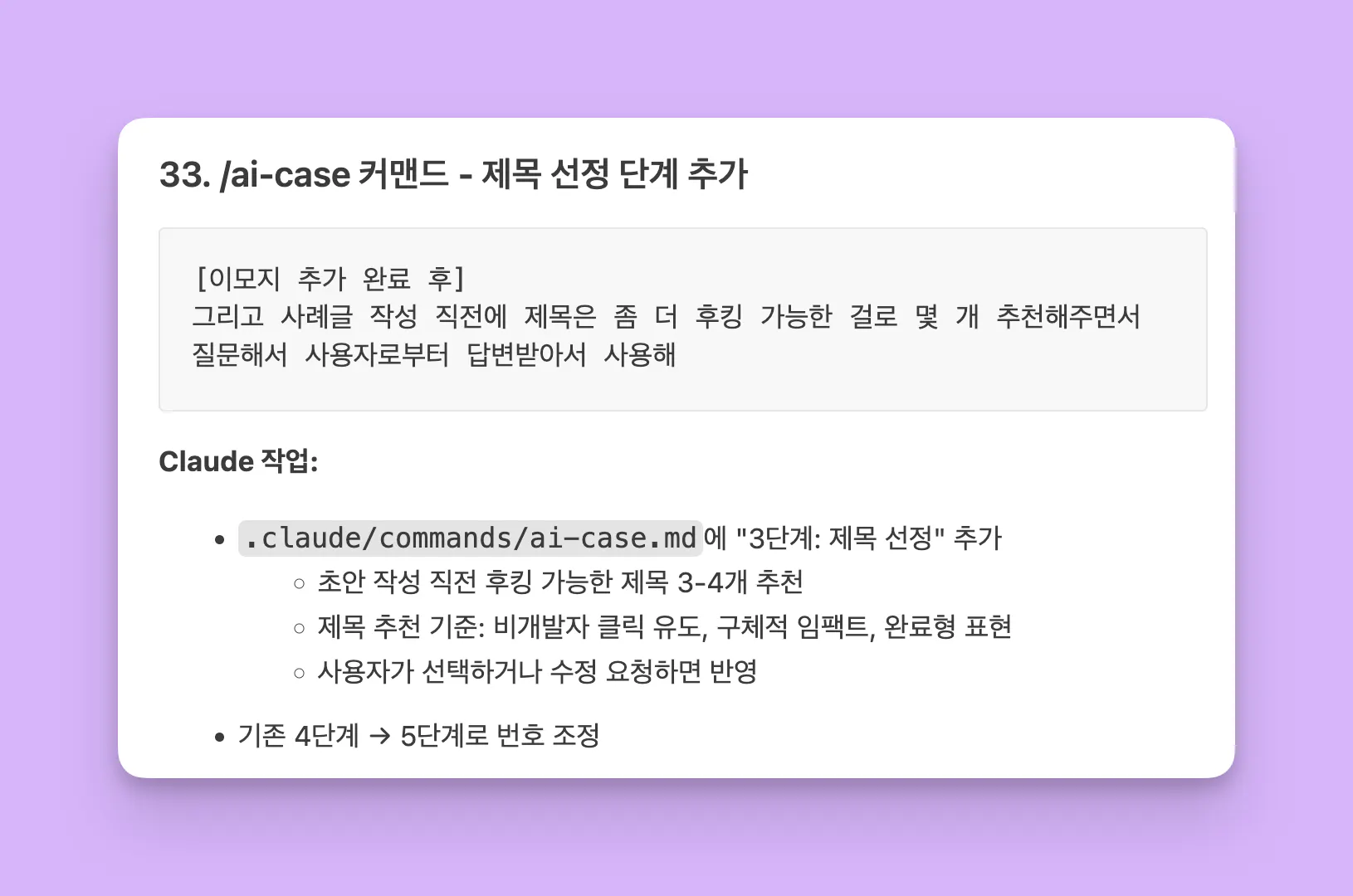 3. /ai-case ์ปค๋งจ๋“œ ์ƒ์„ฑ โ†’ DEVLOG ๊ธฐ๋ฐ˜์œผ๋กœ ์‚ฌ๋ก€๊ธ€ ์ž๋™ ์ž‘์„ฑ ์›Œํฌํ”Œ๋กœ์šฐ ์„ค๊ณ„