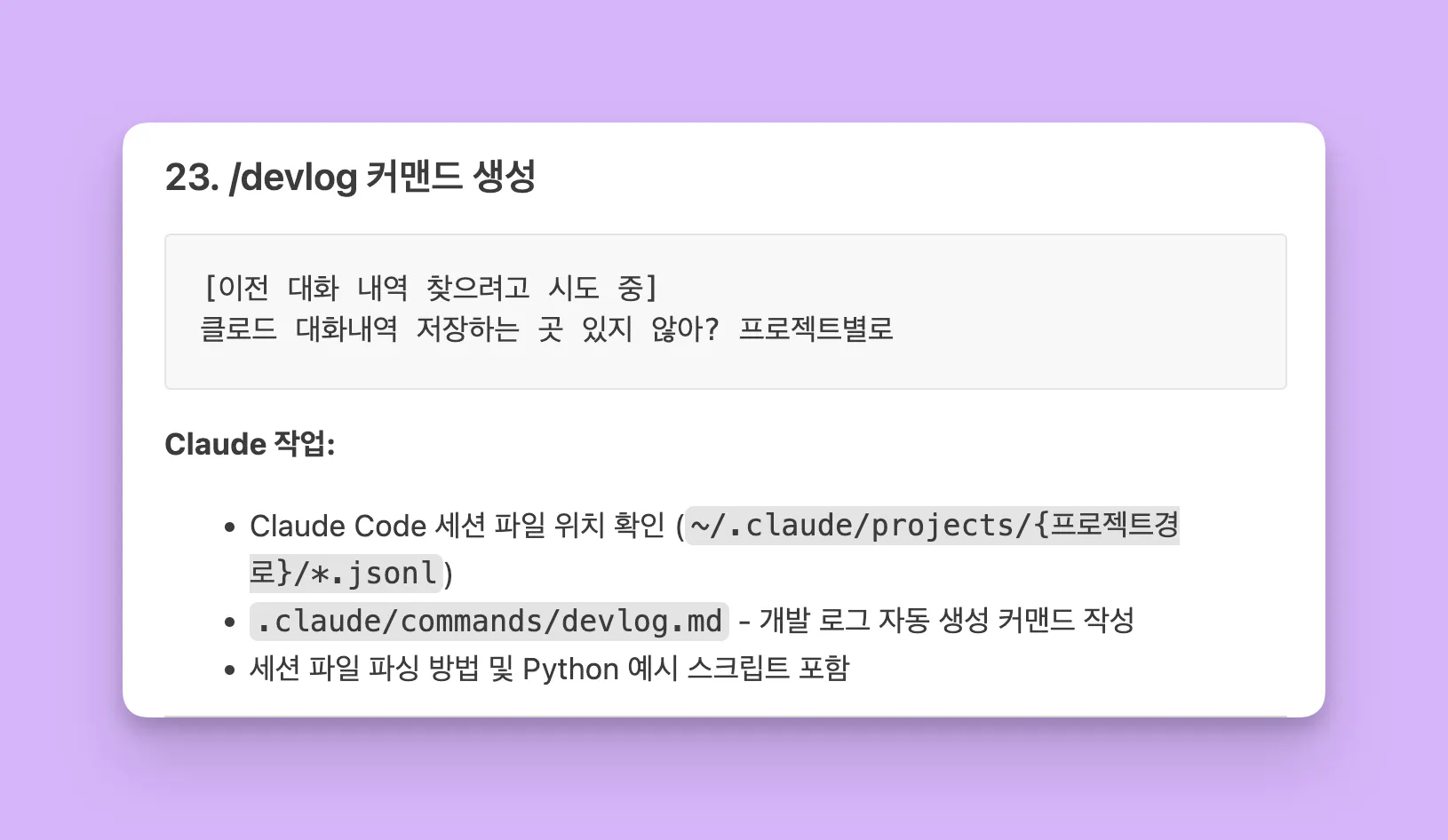 2. /devlog ์ปค๋งจ๋“œ ์ƒ์„ฑ โ†’ ์„ธ์…˜ ํŒŒ์ผ์„ ํŒŒ์‹ฑํ•ด์„œ ๊ฐœ๋ฐœ ๋กœ๊ทธ ์ž๋™ ์ƒ์„ฑ