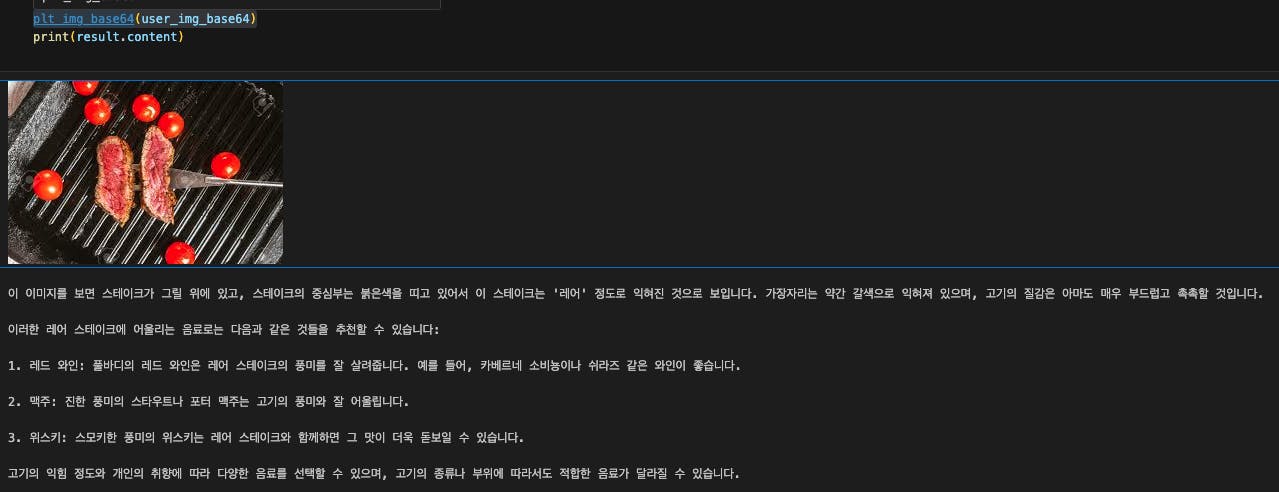 context = invoke_chat_with_image(meet_question, img_base64)출력결과 : [content = “이 이미지는 스테이크의 다양한 익힘 정도를 보여주고 있습니다. 각 단계별로 스테이크의 색깔과 질감이 어떻게 변하는지 설명하겠습니다.\n\n1. Rare (레어): 스테이크의 중심부가 대부분 붉은색을 유지하며, 가장자리는 약간 갈색으로 익혀져 있습니다. 중심부의 온도는 매우 낮으며, 고기의 질감은 매우 부드럽고 촉촉합니다.\n\n2. Medium Rare (미디엄 레어): 중심부는 여전히 붉은색이지만, 레어보다는 조금 더 익혀져 있으며, 가장자리는 더욱 갈색으로 변합니다. 중심부의 온도가 조금 더 올라가고, 고기는 여전히 부드럽지만 레어보다는 조금 더 탄력이 있습니다.\n\n3. Medium (미디엄): 중심부가 분홍색을 띠며, 가장자리는 잘 익은 갈색을 보입니다. 고기의 질감은 탄력 있고 촉촉하며, 중심부의 온도가 더 올라가서 고기의 주스가 적당히 유지됩니다.\n\n4. Medium Well (미디엄 웰): 중심부에 약간의 분홍색이 남아 있지만, 대부분 갈색으로 변합니다. 고기는 더욱 탄력 있고, 주스는 적어지며, 질감은 미디엄보다는 조금 더 단단합니다.\n\n5. Well Done (웰던): 고기 전체가 완전히 갈색으로 익혀져 있으며, 중심부에 분홍색이 전혀 남아 있지 않습니다. 고기의 질감은 가장 단단하고, 주스가 거의 없어져서 건조할 수 있습니다.\n\n각각의 익힘 정도는 개인의 취향에 따라 선택되며, 고기의 종류나 부위에 따라서도 적합한 익힘 정도가 달라질 수 있습니다.'“]