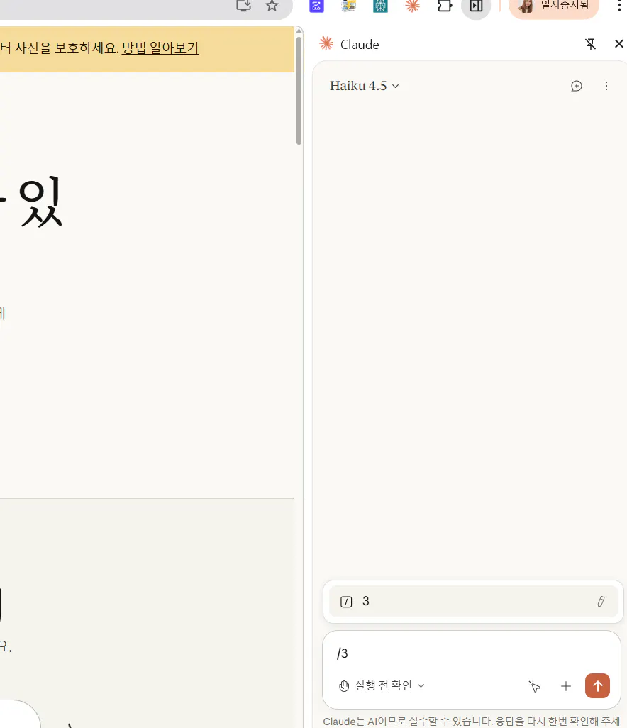 - 민감한 정보(카드번호, 개인정보)는 Claude가 입력하지 않도록 하세요