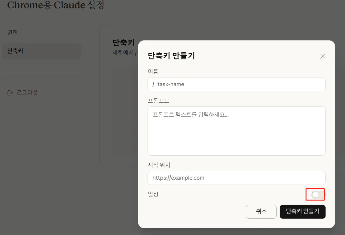 1. Claude 브라우저 설정 → Shortcuts
