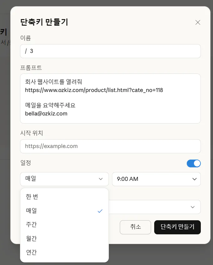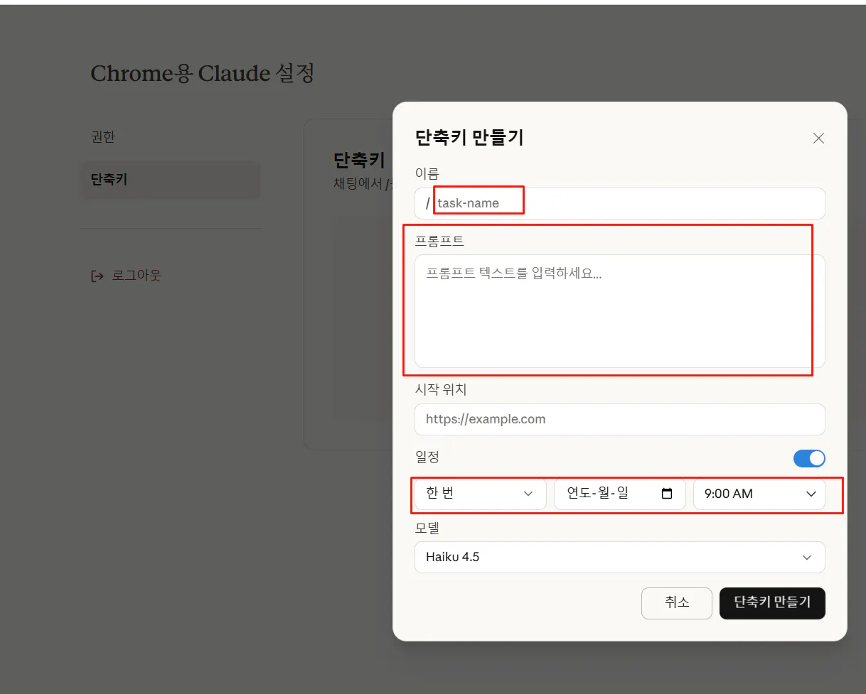 Claude 브라우저의 단축키(Shortcuts) 기능을 활용해 워크플로우를 저장합니다.