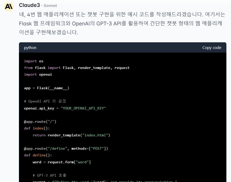 오~ 4번이 솔깃한데요~ 4번으로 작성해 달라고 했습니다. 그런데 Claude씨가 자기 API를 쓰지는 않고 OpenAI API를 써서 구현합니다.