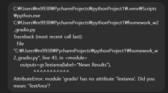2주차 과제 네이버서치에서 키워드를 입력하면 csv 파 일로 저장하는 것을 과제로 했는데, 여기에 지난주 랭체인발표에서 김이언님의 설명중에 들었던 Gradio UI로 보여주면 좋겠다는 생각에 그부분을 추가해 보았다.