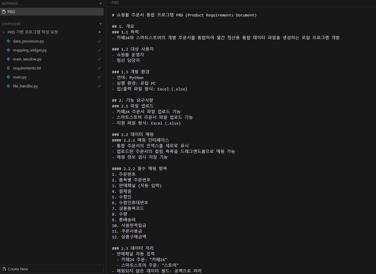 결과로 받은 PRD 내용을 Cursor에 등록하고 프로그램을 작성해보겠습니다.