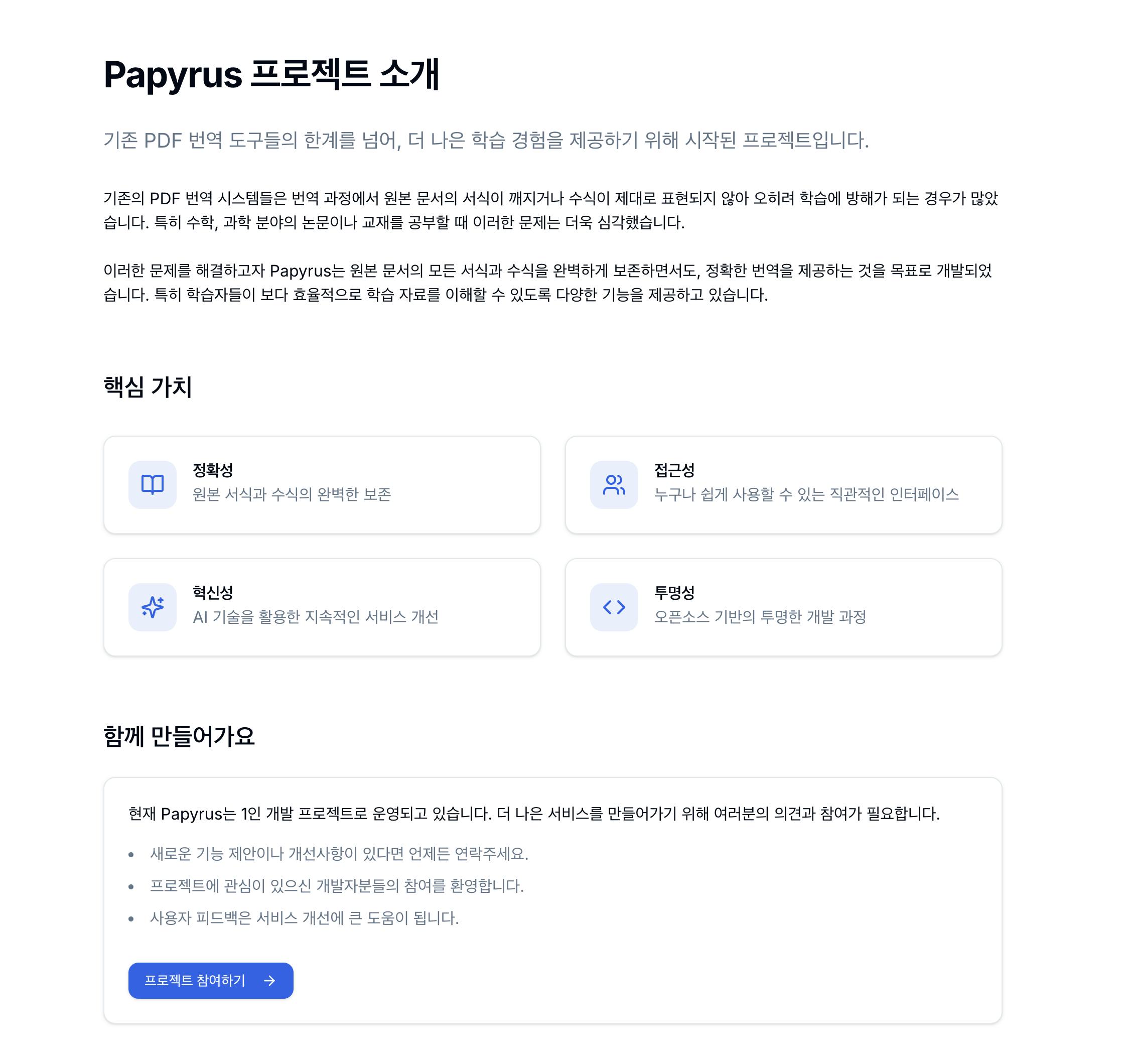 Papyrus는 학술 PDF 문서의 원본 레이아웃, 서식 및 시각적 요소를 유지하면서 번역하도록 설계된 웹 기반 도구입니다. 본 문서는 Papyrus 개발을 위한 기능 요구사항과 사양을 설명합니다.
