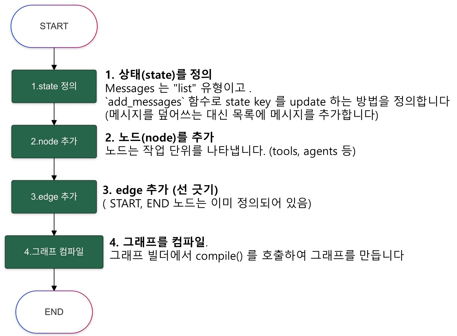 메시지를 직접 덮어쓰지 않고 현재 목록에 추가합니다. 이는 Annotated에 미리 빌드된 add_messages 함수를 통해 전달됩니다.