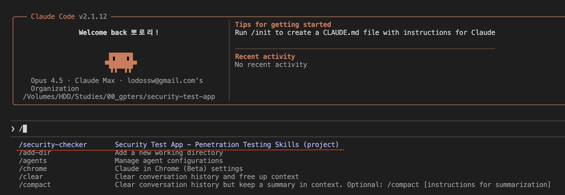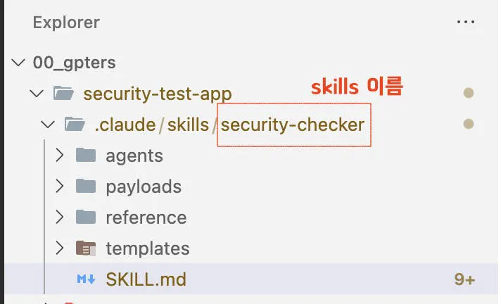 위에처럼 프로젝트의 .claude 디렉토리에 만들어진 skills 넣으면 디렉터로 명으로 skills가 로딩됩니다.