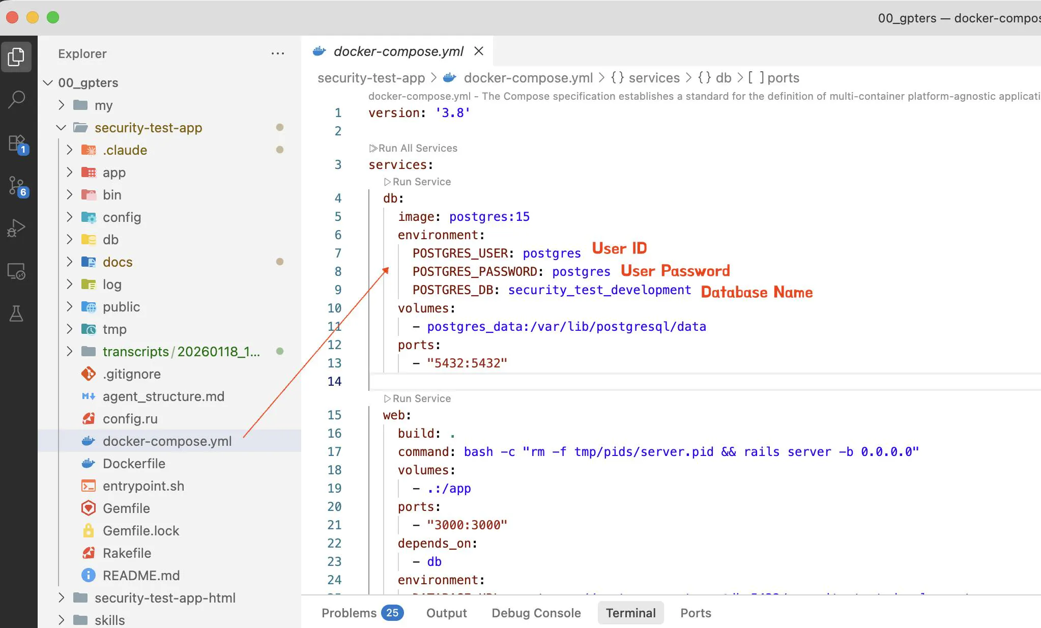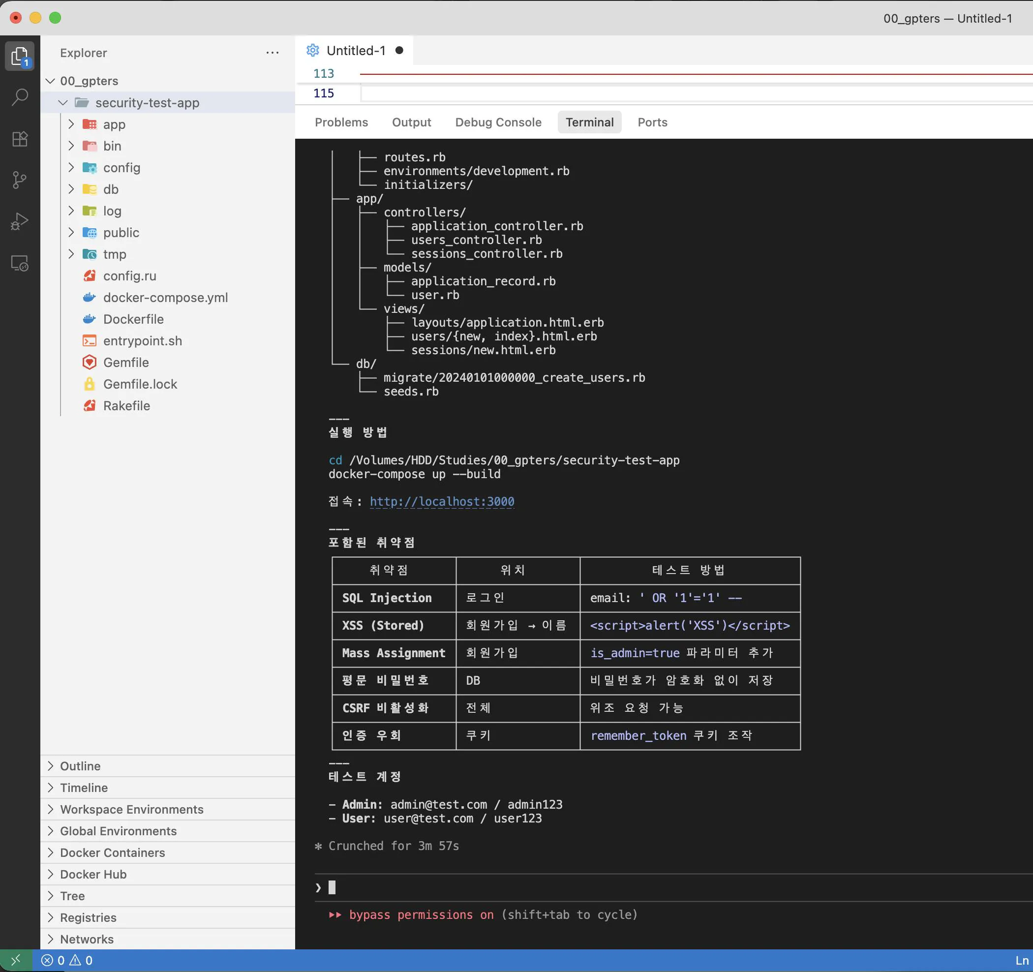 7ffbf9887bd9   security-test-app-web   "entrypoint.sh bash …"   15 hours ago   Up 13 hours   0.0.0.0:3000->3000/tcp, [::]:3000->3000/tcp   security-test-app-web-1