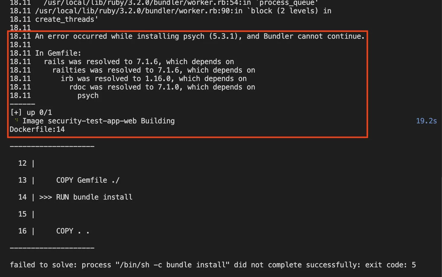 18.11 18.11 An error occurred while installing psych (5.3.1), and Bundler cannot continue. 18.11 18.11 In Gemfile: 18.11 rails was resolved to 7.1.6, which depends on 18.11 railties was resolved to 7.1.6, which depends on 18.11 irb was resolved to 1.16.0, which depends on 18.11 rdoc was resolved to 7.1.0, which depends on 18.11 psych