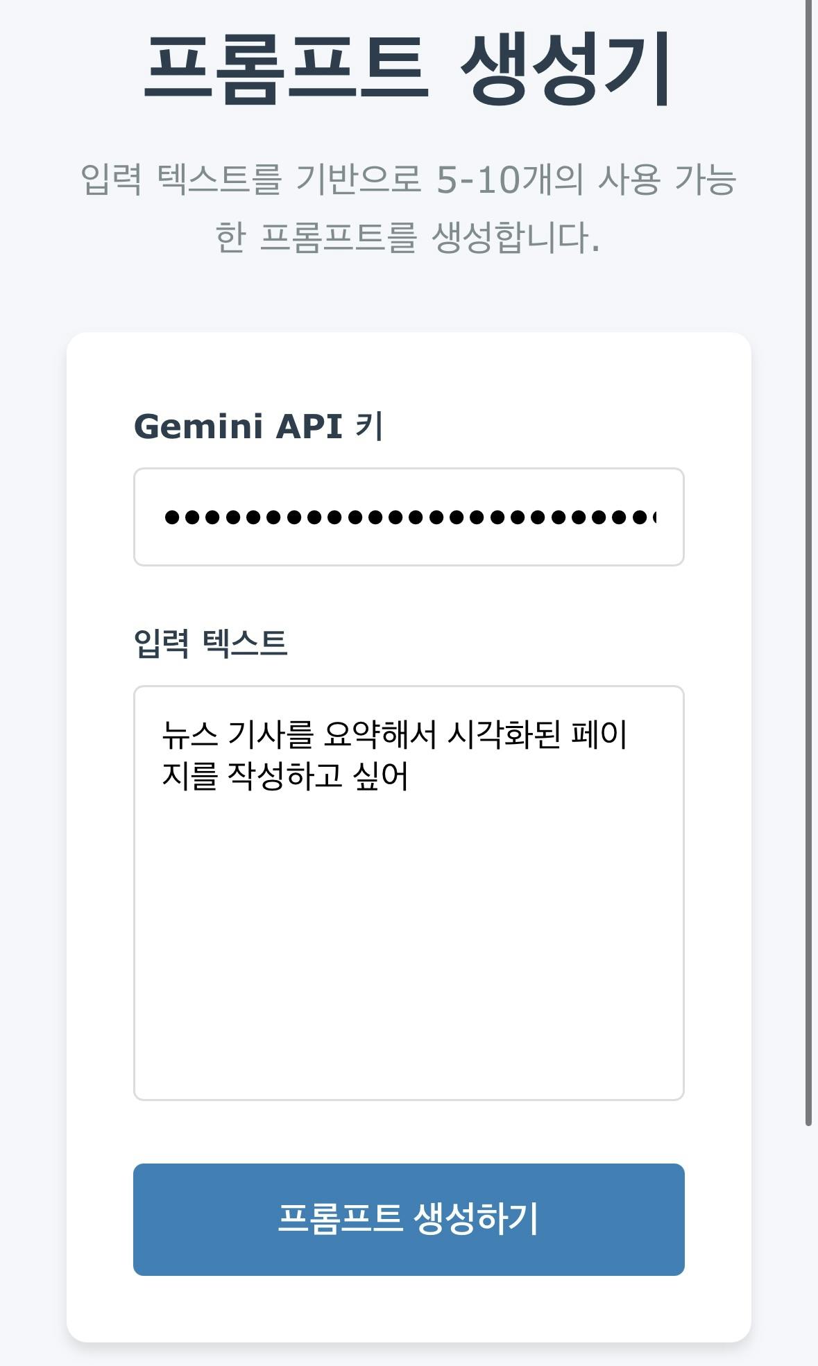 AI 프롬프트 제공 계정들이 높은 트래픽을 유도하는 모습을 보고, 저도 비슷한 형태의 콘텐츠를 만들어보고자 MANUS AI에 프로젝트 개발을 의뢰하게 되었습니다. 목표는 Gemini API를 활용하여 콘텐츠 생성용 프롬프트를 손쉽게 만들 수 있는 웹페이지를 개발하는 것이었습니다. 특히, 개발 요청에 사용된 프롬프트는 제가 직접 개발한 프롬프트 생성기를 통해 생성되었습니다.