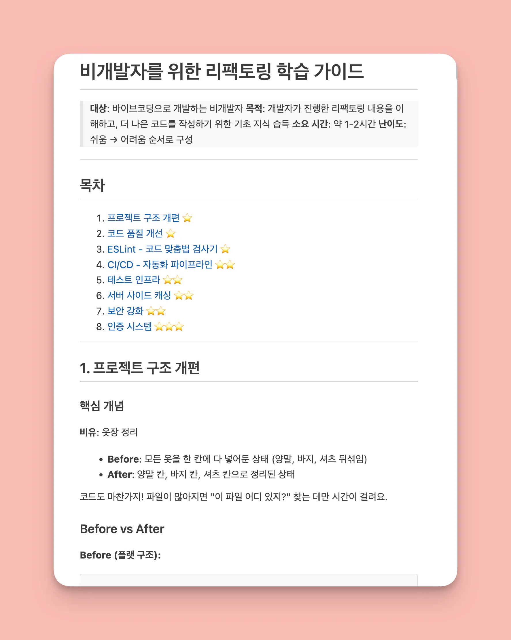 바이브코딩 후 받은 개발자 리팩토링 보고서를 Claude Code와 함께 학습하고, 팀원용 학습 가이드까지 만든 과정