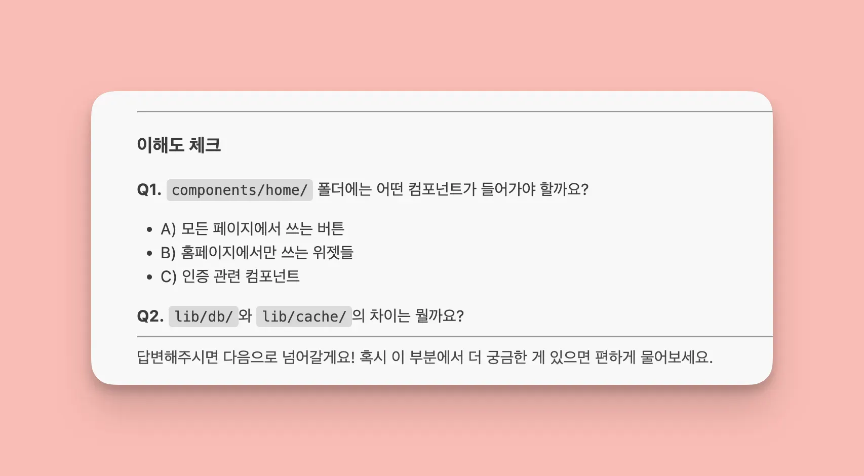 느낀 점: 비유로 "왜 이렇게 하는지" 이해하고, 실제 코드 예시로 "어떻게 적용하는지" 감을 잡았어요. 다음에 바이브코딩할 때 "폴더 구조 정리해줘", "중복 코드 유틸리티로 빼줘" 같은 요청을 할 수 있게 됐어요.