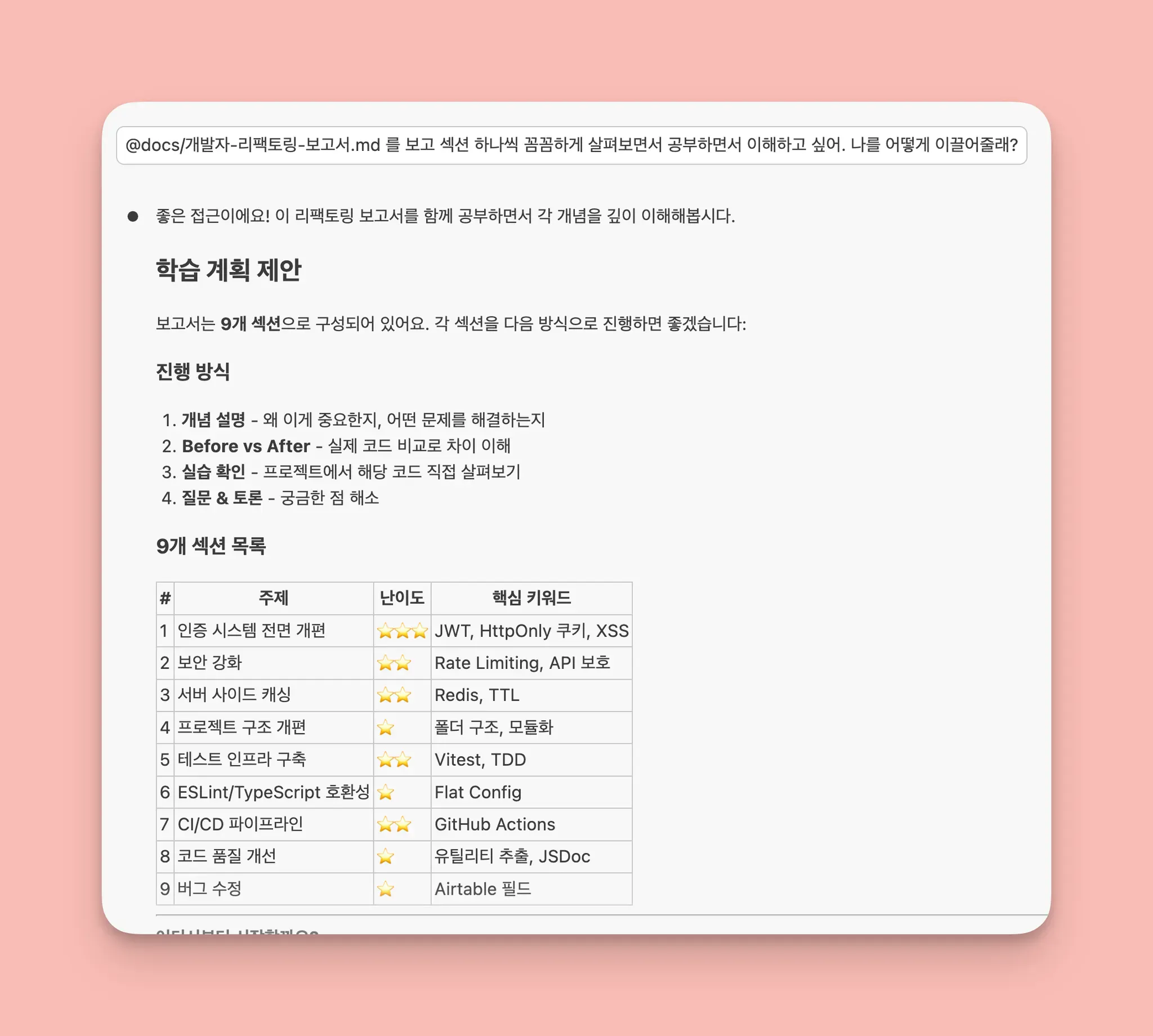 @docs/개발자-리팩토링-보고서.md 를 보고 섹션 하나씩 꼼꼼하게 살펴보면서 공부하면서 이해하고 싶어. 나를 어떻게 이끌어줄래?