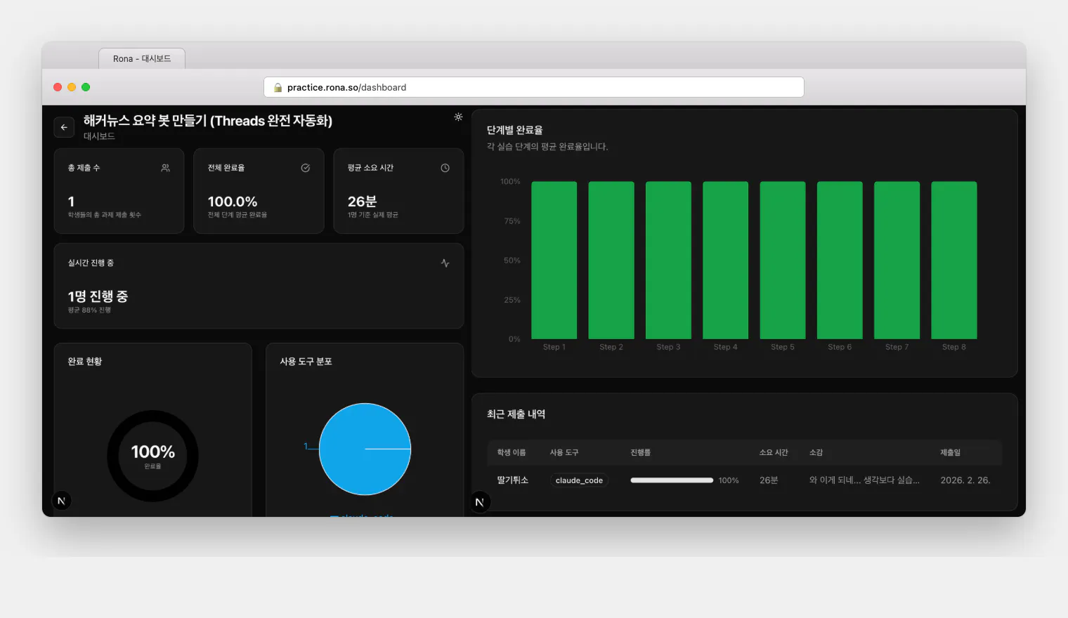 • 수강생의 실습 현황을 자동으로 대시보드화해서 볼 수 있어요.
